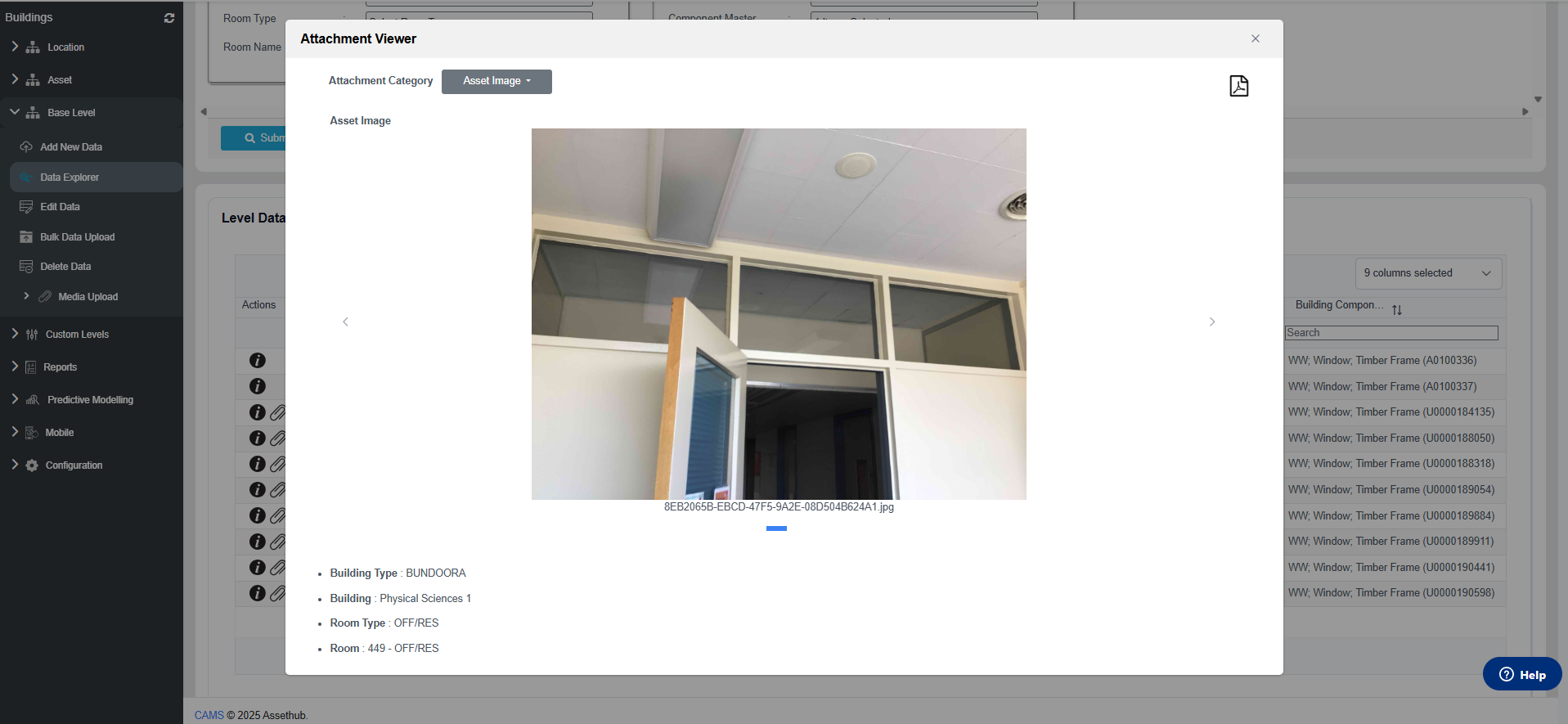 This article explains how to view attachments such as asset or inspection images in CAMS Web using the Data Explorer. Attachments can be created at any level of the asset hierarchy, depending on where the attachments have been uploaded.
