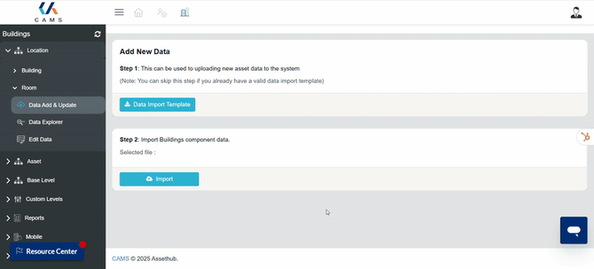 This article explains how users can add hierarchy data (Building, Room, Component) in CAMS, including steps for downloading, completing, and importing data templates.